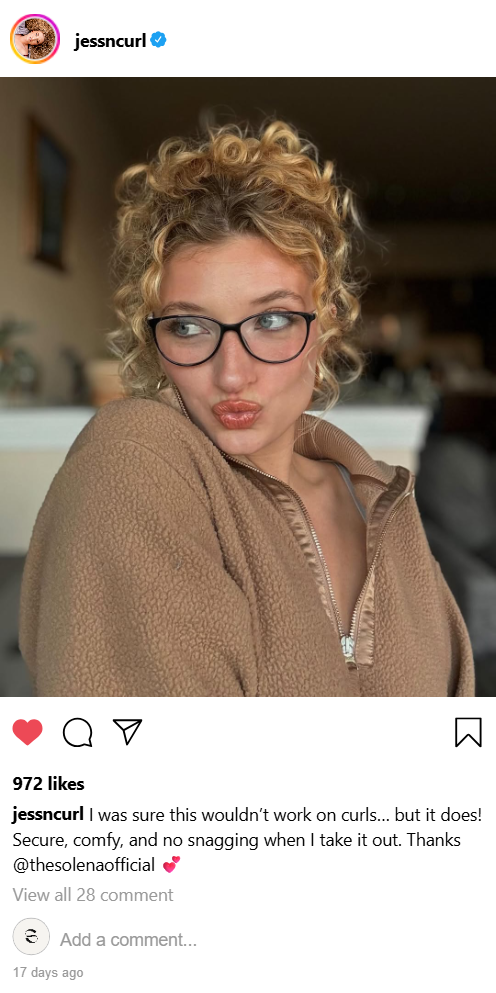 Como la horquilla se ajusta al ras de la cabeza, se siente cómoda y discreta en tu cabello. Sin puntos de presión, sin dolor en el cuero cabelludo, solo una sujeción ligera de la que te puedes olvidar. Está diseñada para todo tipo de cabello y longitud: fino, grueso, rizado, liso, largo o corto .